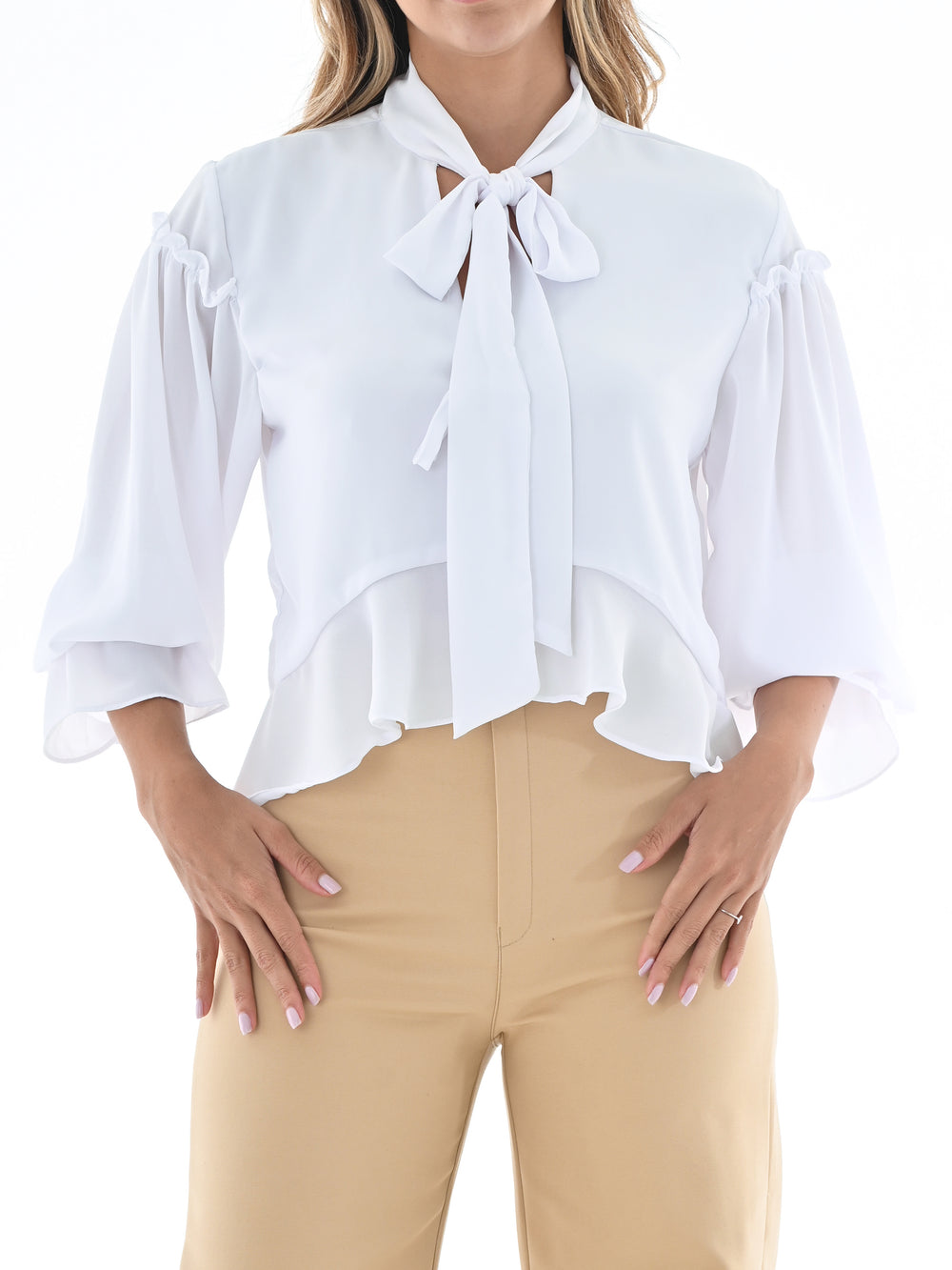 Blusa estilo boho, manga larga con cuello para anudar, abierto en centro delantero con bies en centro para cerrar con lazo, ruedo curvo en frente con arandela fruncida en contorno, Manga larga englobada con elástico en alto puño. Elaborado en poliéster.