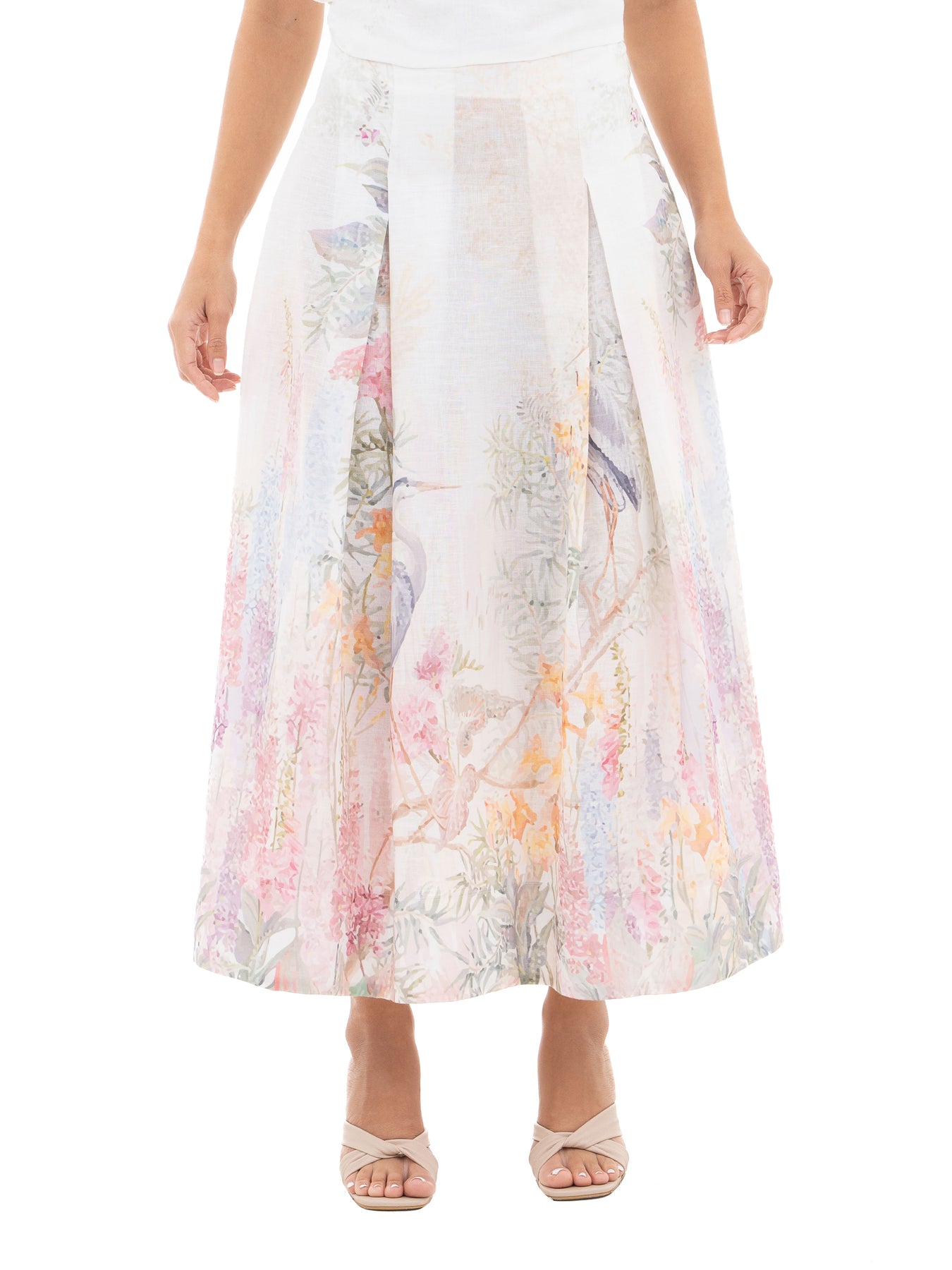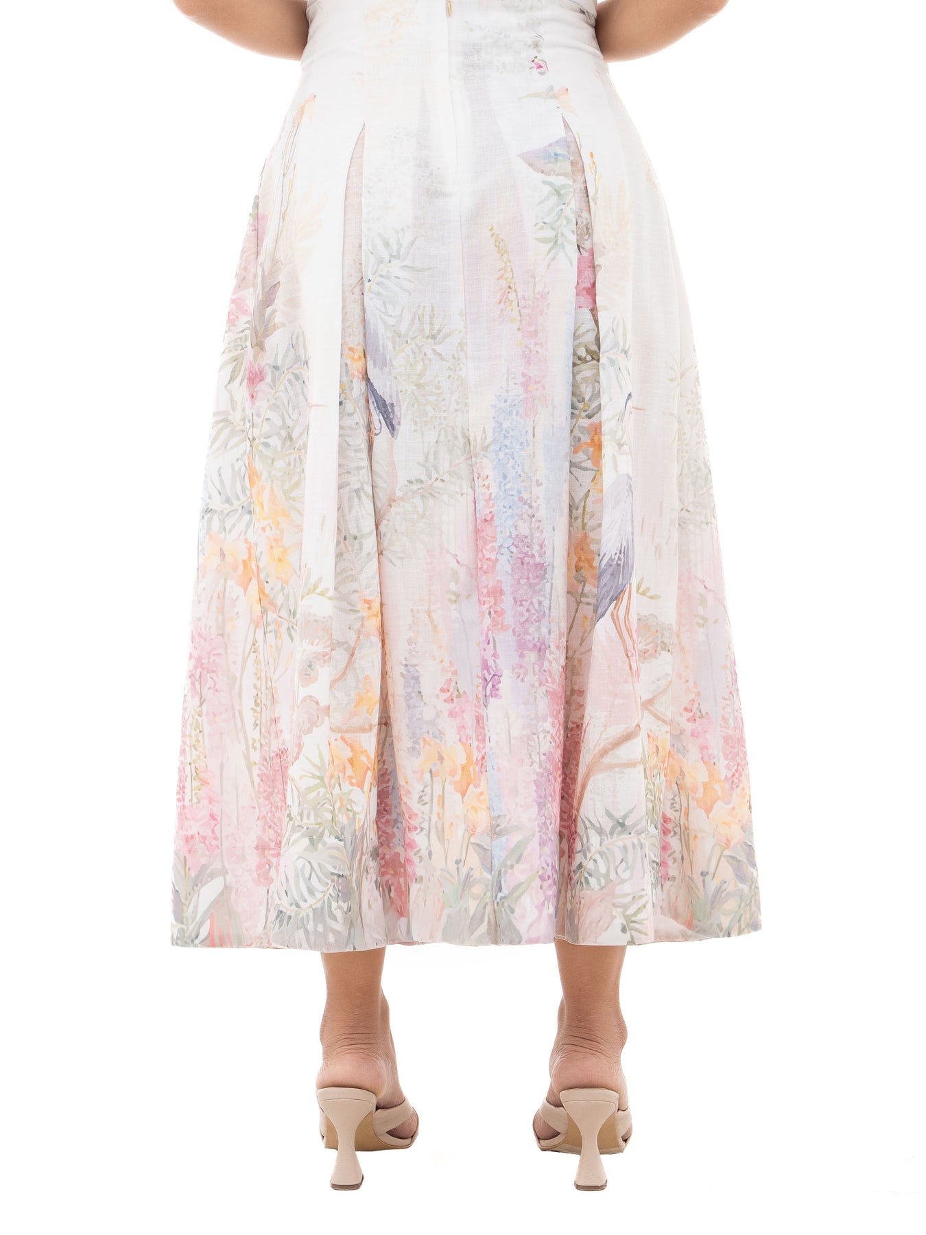 Falda midi de talle alto con diseño elegante y femenino, confeccionada sin pretina para un acabado limpio y moderno. Presenta pliegues en el contorno de la cintura que aportan volumen y movimiento, creando una silueta en línea A que favorece la figura.