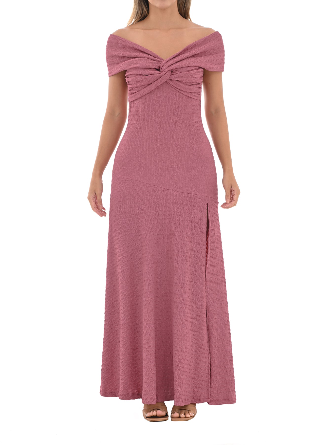 Vestido con escote bandeja y detalle de dobles en el centro del busto, que resalta la parte superior de forma elegante. Su silueta ceñida al cuerpo realza la figura, mientras que el corte asimétrico con abertura en la pierna delantera añade un toque moderno y sofisticado.