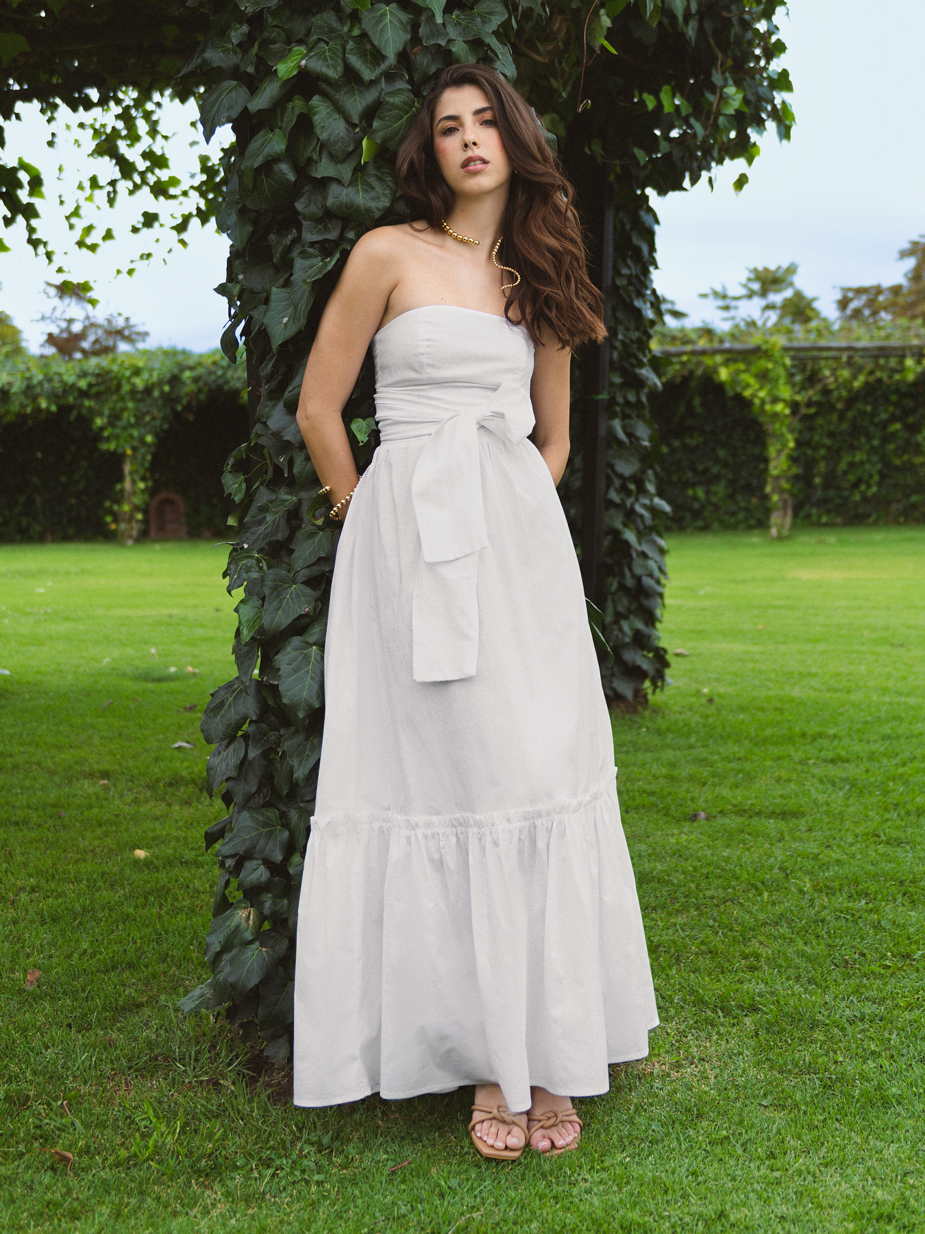 Vestido largo strapless de silueta femenina y sofisticada, con cortes en el frente que entallan y realzan la figura. Incorpora tiras para anudar alrededor de la cintura, permitiendo ajustar el calce y definir la silueta según preferencia.