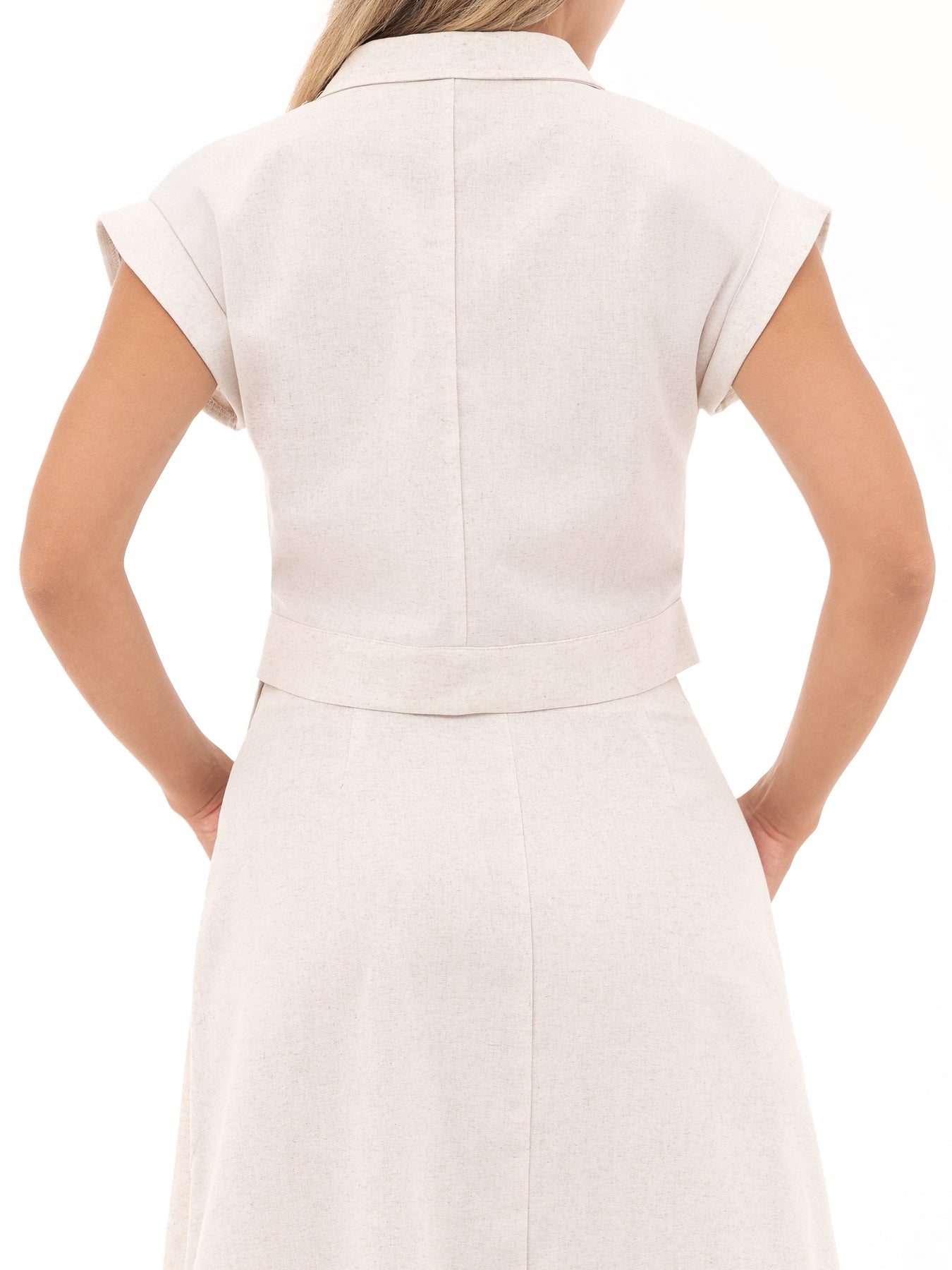 Blusa camisera elegante con botonadura escondida para un acabado limpio y sofisticado. Diseño con manga corrida terminada en guardapolvo y alforzas en los frentes que añaden un detalle delicado y femenino. Elaborada en lino rayón, fresca y ligera, ideal para climas cálidos. Coordina con la Falda Delvin para un look armónico y versátil.
