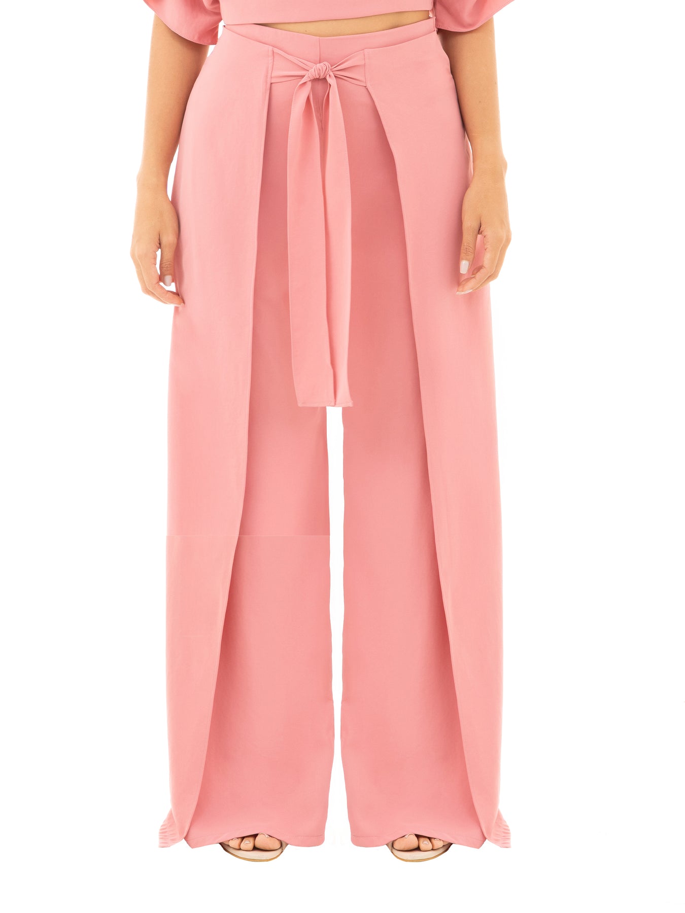 Pantalón de talle alto con diseño fluido y femenino, que incorpora una abertura tipo pétalo en el frente para aportar movimiento y un toque sofisticado. Cuenta con lazo para anudar en la parte delantera, que permite ajustar y estilizar la cintura, y zipper trasero para un cierre práctico y discreto. Su silueta elegante lo convierte en una prenda versátil para looks modernos y refinados.