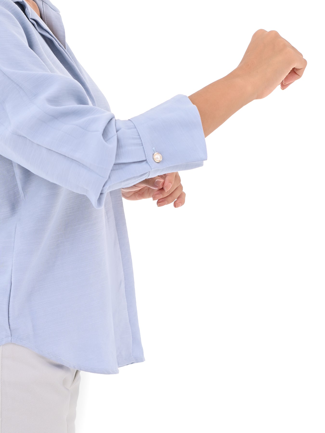 Camisa de estilo clásico y elegante, con botonadura escondida en el frente y puños con un botón decorativo que aportan un toque refinado. Su ruedo curvo favorece la silueta y permite usarla por dentro o fuera del pantalón. Elaborada en rayón poliéster, una mezcla suave y fluida ideal para todo el día.