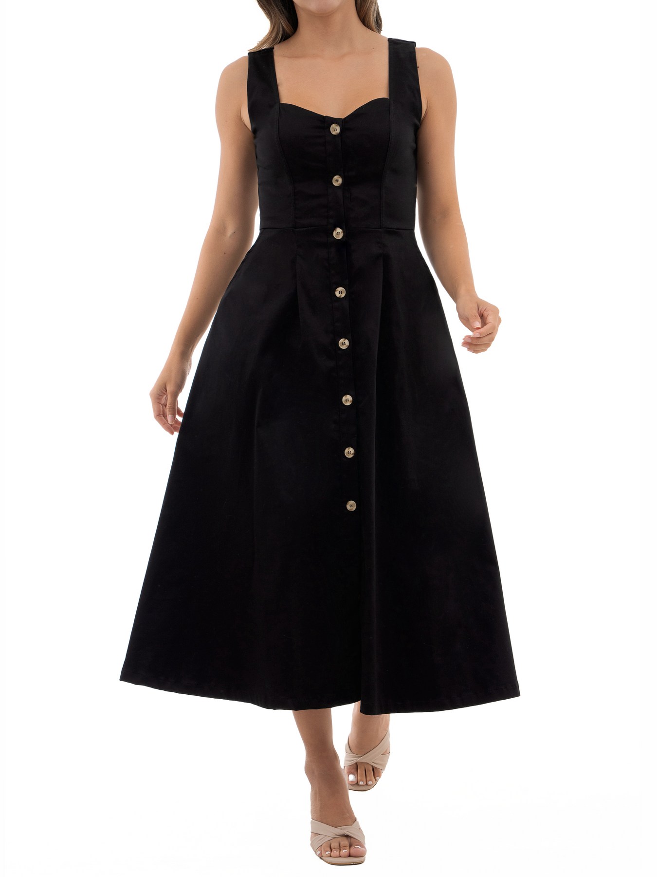 Vestido largo con tirantes gruesos y escote corazón, botones funcionales en el centro delantero. Falda en línea A con pliegues que aportan volumen y bolsillos laterales para mayor practicidad. Elaborado en algodón stretch.
