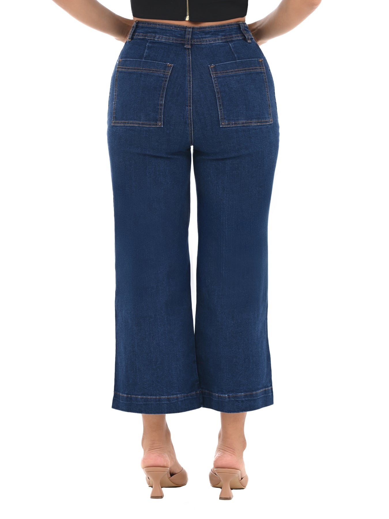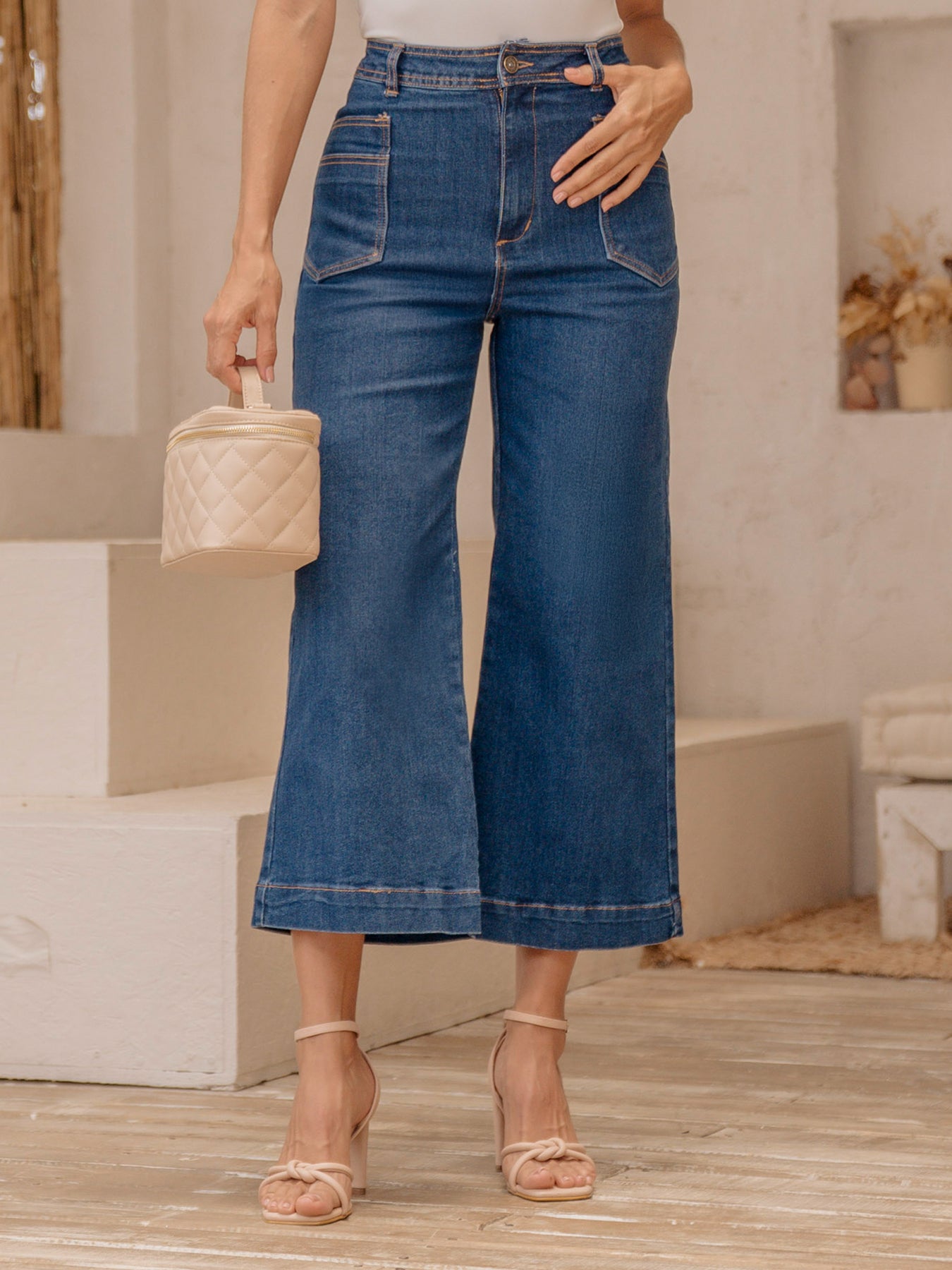 Jean con horma culotte que combina una silueta moderna y favorecedora. Presenta pretina anatómica con pasadores en el contorno, botón y zipper en el centro delantero para mejor ajuste. Incluye bolsillos de parche en frentes y parte trasera, aportando un toque funcional y casual. Elaborado en algodón poliéster stretch, brindando suavidad, resistencia y comodidad en el movimiento.